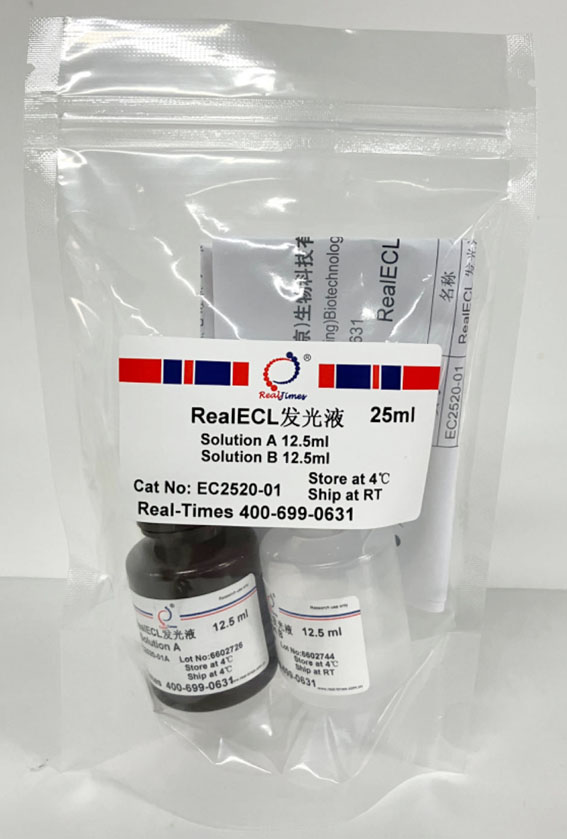 RealECL 是一種超敏ECL化學(xué)發(fā)光試劑盒,可與二抗上耦連的辣根過(guò)氧化物酶(HRP)發(fā)生化學(xué)反應(yīng),發(fā)出熒光,從而可以通過(guò)用X光片壓片或其它適當(dāng)熒光成像設(shè)備檢測(cè)樣品。RealECL具有極高靈敏度和高信噪比,可檢測(cè)出10-100 fg的微量抗原;發(fā)光迅速,熒光可使X感光膠片感光達(dá)1小時(shí)以上,特別適用于痕量蛋白檢測(cè);另外高靈敏度可以大大節(jié)省寶貴的樣品以及非常昂貴的一抗和二抗的用量,降低實(shí)驗(yàn)成本。