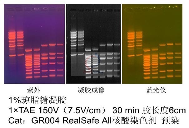 將RealSafe All試劑按1:10000溶于瓊脂糖凝膠溶液中,充分混勻。(例如:將5 μl 染料加入到50 ml 凝膠溶液中)。注:由于RealSafe All具有出色的熱穩(wěn)定性,可將試劑直接加入高溫的凝膠溶液中,而不用等凝膠溶液冷卻后再加入。