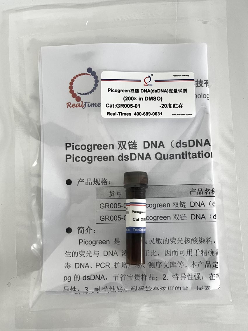 Picogreen 是一種極為靈敏的熒光核酸染料,其僅在與DNA 雙鏈結(jié)合后才發(fā)出熒光,且所產(chǎn)生的熒光與 DNA 濃度呈正比,因而可用于精確測(cè)量多個(gè)來源的 dsDNA,包括基因組 DNA、病毒 DNA、PCR 擴(kuò)增產(chǎn)物、測(cè)序文庫等。本產(chǎn)品定量具有以下優(yōu)勢(shì):1. 靈敏度高:可檢測(cè)低至200 pg的dsDNA,節(jié)省寶貴樣品;2. 特異性強(qiáng):在等摩爾的RNA存在的條件下,對(duì)dsDNA具有特異性;3. 耐受性好:耐受較高濃度的鹽、尿素、乙醇、氯仿、去垢劑、蛋白或瓊脂糖,可以直接定量PCR擴(kuò)增產(chǎn)物而無需從反應(yīng)混合物中純化DNA。4. 易于使用-只需在樣品中加入染料,等待5分鐘,然后讀數(shù)即可,且適用于96和384孔板;與大多數(shù)基于熒光的酶標(biāo)儀和熒光計(jì)兼容。5. 適用范圍廣:可適用于PCR的分析、芯片樣品、DNA損傷分析、酶活分析、基因組DNA定量以及復(fù)雜混合物中dsDNA的檢測(cè)和病毒DNA定量等多種領(lǐng)域。