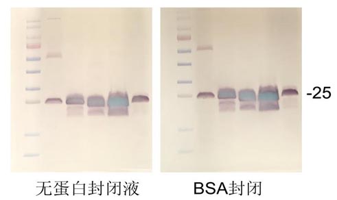 注意:使用本產品,PVDF膜和NC膜使用推薦封閉時間,經多種抗體的測試封閉效果顯著優(yōu)于常規(guī)的BSA封閉1 h。對于一些背景非常高的抗體,可以嘗試延長封閉時間。如有特殊需要,也可4℃封閉過夜。
