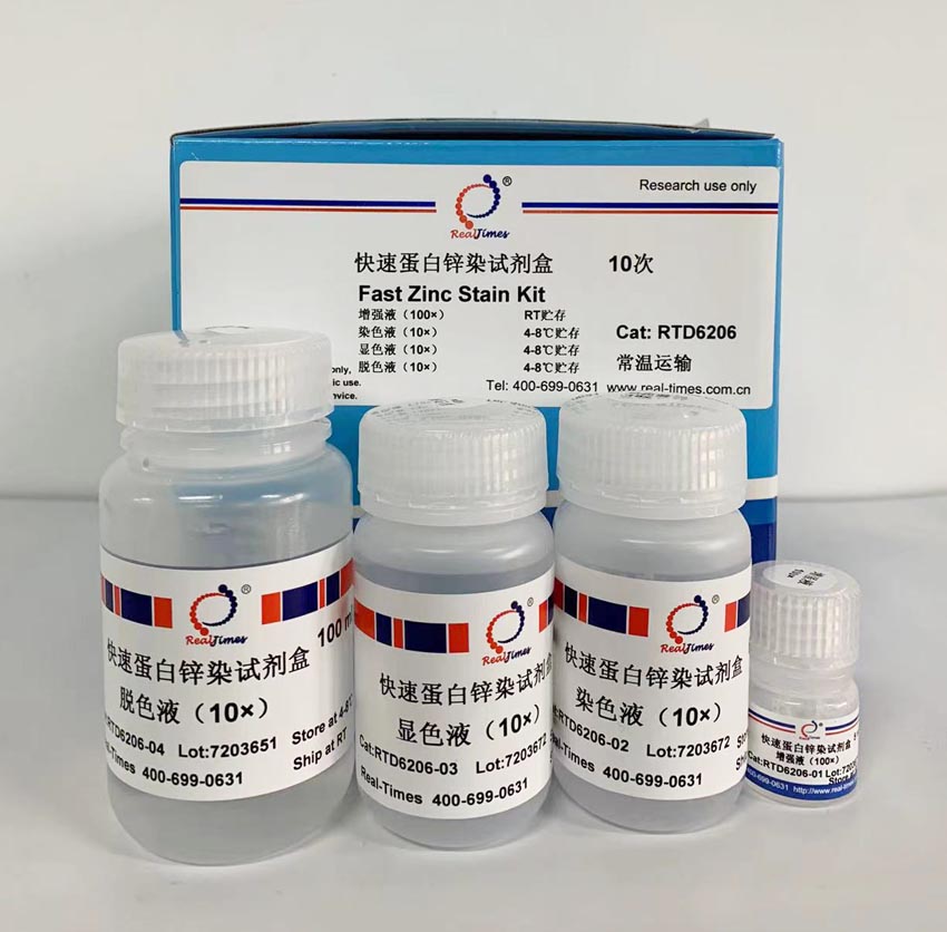 本試劑采用以鋅離子為基礎(chǔ)的負(fù)染色方法,用于SDS-PAGE或Native-PAGE電泳凝膠染色,不需要使用含有刺激性的甲醛和冰醋酸,實驗方便快速,可以在30 min左右完成,最低能夠檢測出2 ng的蛋白條帶,該方法不對蛋白質(zhì)產(chǎn)生修飾作用,而且經(jīng)過脫色液處理后,可以用于電洗脫或采用PAGE膠蛋白微量回收試劑盒(貨號:RTD8108)進(jìn)行膠回收,以便進(jìn)行質(zhì)譜和測序分析等,也可以用于其他染色方法(銀染或考染)對膠重新染色。