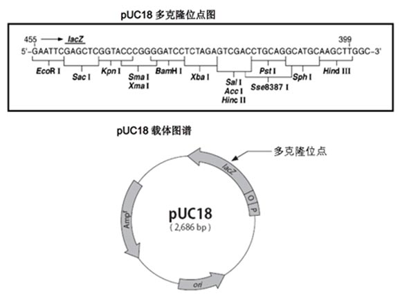 pUC18 載體適用于雙脫氧法對(duì)DNA 片段進(jìn)行測(cè)序,它克隆的 DNA 片段比使用 M13 phage作載體時(shí)克隆的片段長(zhǎng)。 由于在 lacZ 領(lǐng)域中含有多克隆位點(diǎn), 因此可以在含有 IPTG、 X-Gal的平板培養(yǎng)基上通過藍(lán)白篩選判斷載體中有無 DNA 片段的插入。同時(shí)還可以通過載體上的lac promoter表達(dá)外源基因, 使用M13系列的通用引物對(duì)插入載體中的DNA片段進(jìn)行測(cè)序。
